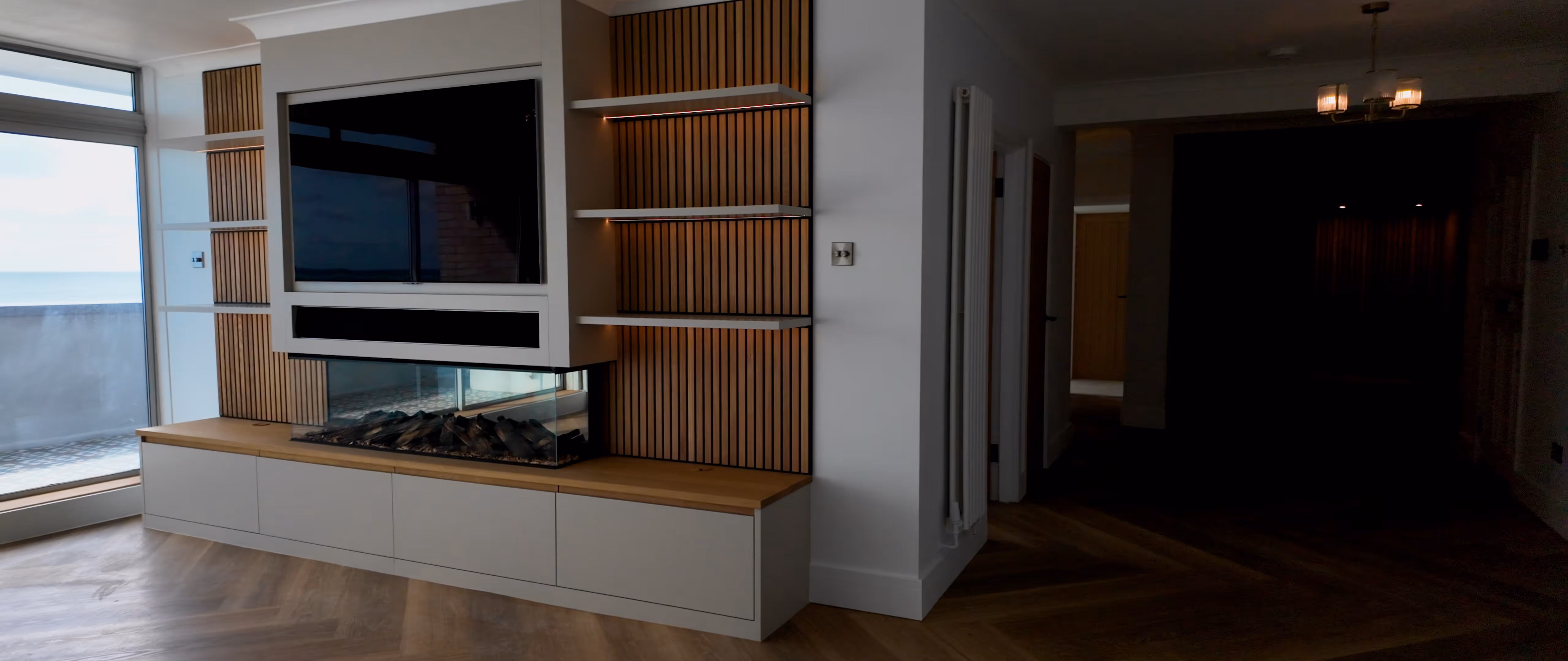 Custom Carpentry Sussex were commissioned to deliver a full interior joinery package for this stylish Eastbourne seafront flat, creating a cohesive, contemporary living space with warmth, texture and intelligent storage throughout. The brief was to maximise functionality while introducing high-end design features that complemented the property’s coastal setting and modern architectural feel.